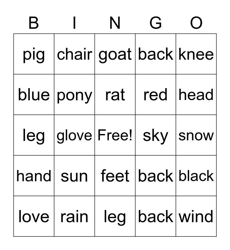 This bingo card has a free space and 29 words: love, dove, glove, dog, pig, goat, pony, sun, sky, rain, snow, wind, leg, back, head, nose, feet, hand, knee, leg, back, milk, red, blue, back, chair, black, rat and fox.