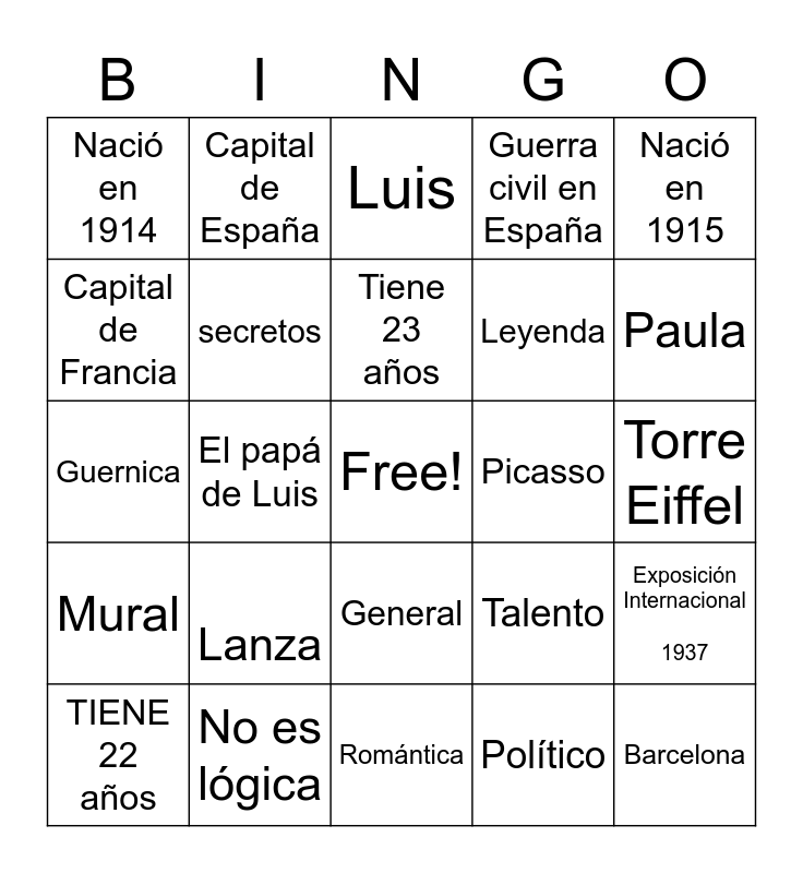 This bingo card has a free space and 24 words: Lanza, No es lógica, Tiene 23 años, TIENE 22 años, Nació en 1915, Nació en 1914, Capital de Francia, Capital de España, Picasso, General, Leyenda, Guernica, Talento, Exposición Internacional 1937, secretos, Político, Torre Eiffel, Luis, Paula, El papá de Luis, Barcelona, Mural, Guerra civil en España and Romántica.