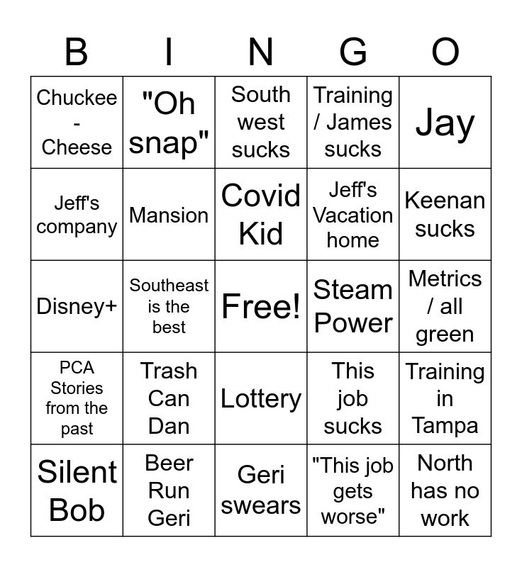 This bingo card has a free space and 24 words: Trash Can Dan, Beer Run Geri, Covid Kid, Silent Bob, Jay, Chuckee - Cheese, Jeff's company, "Oh snap", Steam Power, Lottery, Jeff's Vacation home, Disney+, This job sucks, Training in Tampa, Mansion, "This job gets worse", Metrics / all green, South west sucks, Keenan sucks, Southeast is the best, North has no work, PCA Stories from the past, Training / James sucks and Geri swears.