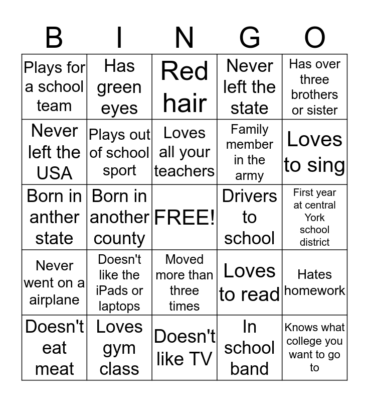 This bingo card has a free space and 24 words: Doesn't like the iPads or laptops, Loves gym class, Loves all your teachers, Doesn't eat meat, Has over three brothers or sister, Plays for a school team, Never left the USA, Has green eyes, Drivers to school, Moved more than three times, Family member in the army, Born in anther state, Loves to read, Hates homework, Plays out of school sport, In school band, First year at central York school district, Red hair, Loves to sing, Born in another county, Knows what college you want to go to, Never went on a airplane, Never left the state and Doesn't like TV.