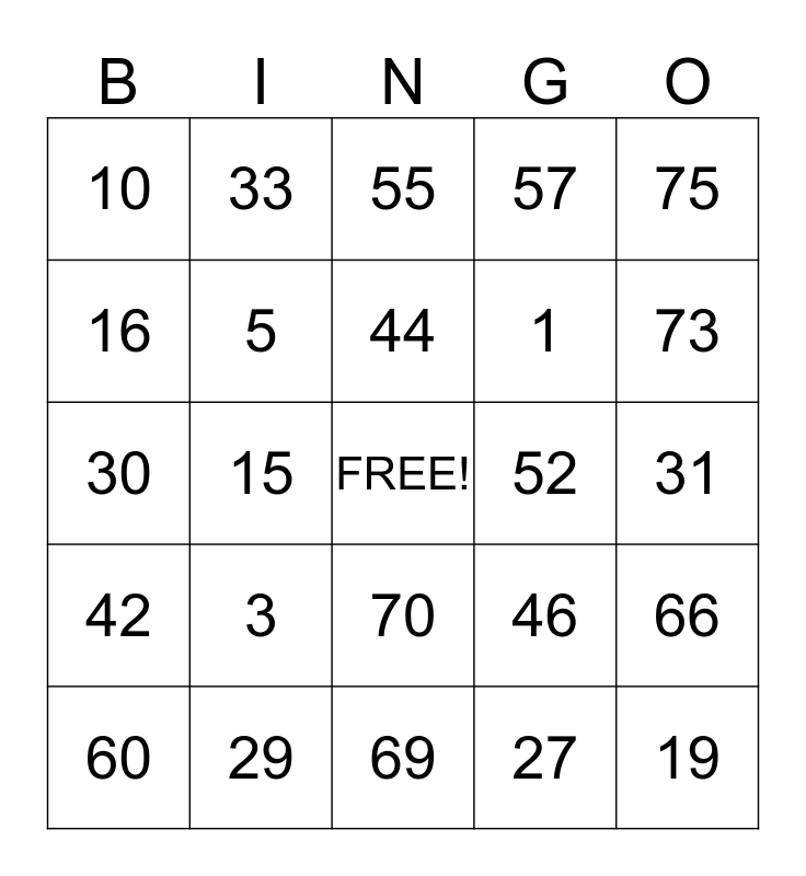 This bingo card has a free space and 24 words: 3, 29, 44, 60, 75, 10, 16, 33, 52, 70, 1, 30, 46, 66, 5, 27, 31, 55, 73, 15, 19, 42, 57 and 69.