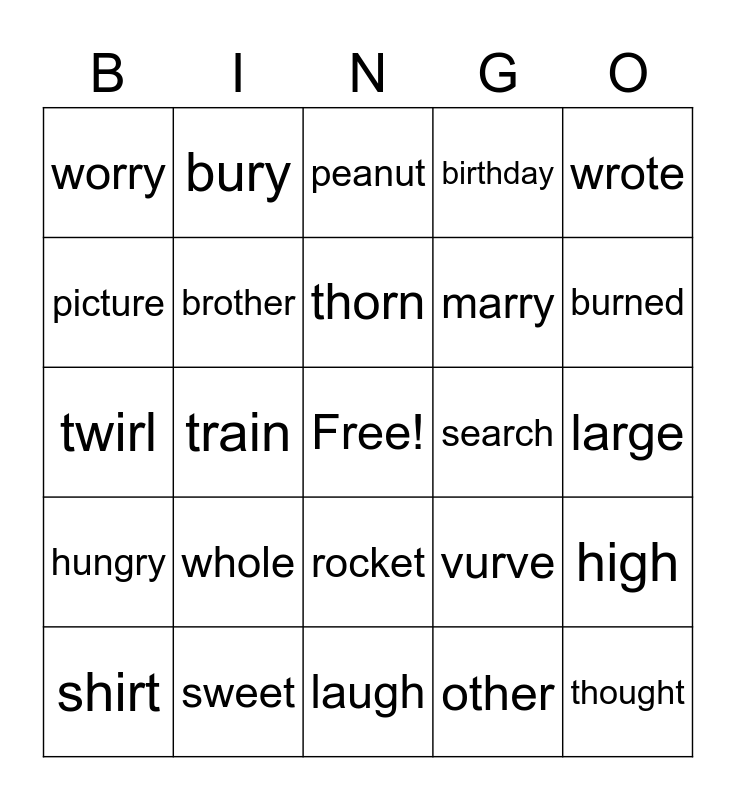 This bingo card has a free space and 50 words: father, thought, people, laugh, whole, around, bury, family, picture, climb, brother, birthday, high, vurve, throw, thirsty, thorn, search, Thursday, wrote, train, other, worry, marry, winter, wonder, burned, narrow, peanut, rocket, furry, second, thirteen, number, sweet, dry, nurse, learn, doctor, large, knot, sneaky, hurry, reply, shirt, twirl, color, disturb, hungry and carrot.