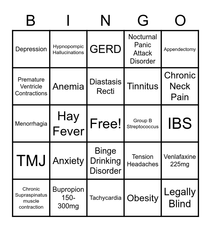 This bingo card has a free space and 24 words: Anxiety, Bupropion 150-300mg, Diastasis Recti, Chronic Supraspinatus muscle contraction, Appendectomy, Depression, Premature Ventricle Contractions, Hypnopompic Hallucinations, Group B Streptococcus, Binge Drinking Disorder, Tinnitus, Menorrhagia, Tension Headaches, Venlafaxine 225mg, Anemia, Obesity, IBS, GERD, Chronic Neck Pain, Hay Fever, Legally Blind, TMJ, Nocturnal Panic Attack Disorder and Tachycardia.