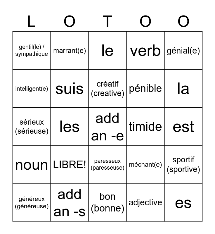 This bingo card has 25 words: LIBRE!, bon (bonne), créatif (creative), généreux (généreuse), génial(e), gentil(le) / sympathique, intelligent(e), marrant(e), timide, paresseux (paresseuse), pénible, sérieux (sérieuse), méchant(e), sportif (sportive), suis, es, est, le, la, les, add an -e, add an -s, noun, verb and adjective.