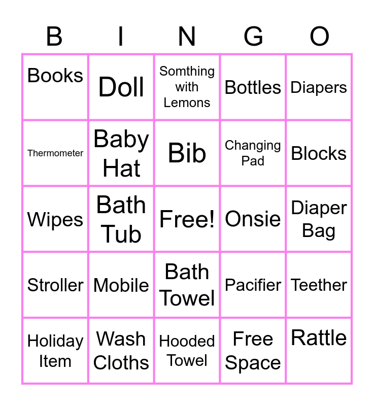 This bingo card has a free space and 35 words: Stuffed Animal, Booties, Socks, Baby Hat, Bath Towel, Bottles, Thermometer, Toys, Bib, Blanket, Wipes, Diapers, Lotions, Gift Card, Books, Onsie, Free Space, Bath Tub, Stroller, Rattle, Pacifier, Holiday Item, Teether, Wash Cloths, Somthing with Lemons, Blocks, Nursery Decor, Bottle Warmer, Changing Pad, Diaper Bag, Rubber Duck, Hooded Towel, Mobile, Doll and Basket.