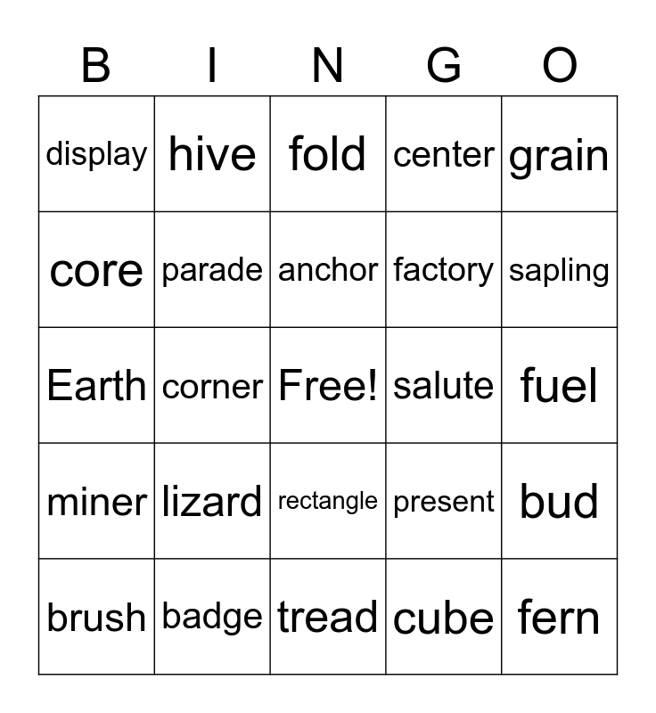 This bingo card has a free space and 30 words: badge, banner, corner, design, display, fold, parade, rectangle, salute, tread, fuel, fern, cube, cone, sapling, seam, present, miner, lizard, grain, Earth, trunk, hive, factory, core, center, bud, brush, anchor and absorb.