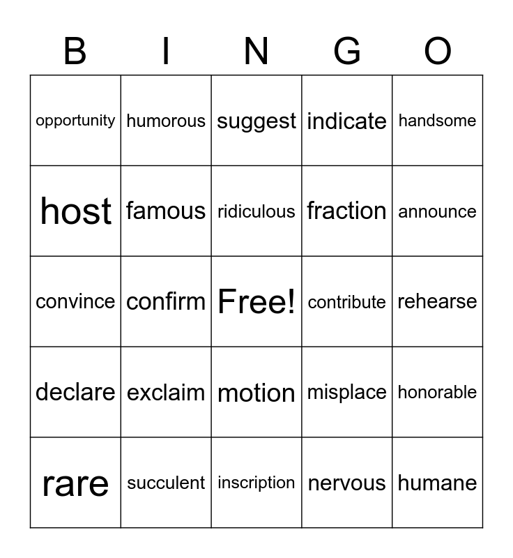 This bingo card has a free space and 24 words: exclaim, succulent, ridiculous, rare, handsome, opportunity, host, humorous, contribute, motion, fraction, convince, misplace, honorable, famous, nervous, rehearse, suggest, announce, confirm, humane, declare, indicate and inscription.