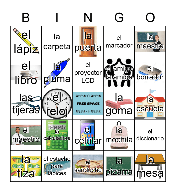 This bingo card has 24 images, a free space and 29 words: la tiza, la compu, el reloj, el sacapuntas, el lápiz, la puerta, la pluma, la calculadora, la goma, el estuche para lápices, la escuela, la mesa, el sanduche, la pizarra, el borrador, la ventana, el celular, el maestro, la maestra, las tijeras, la mochila, el cuaderno, el amigo la amiga, el libro, el marcador, la carpeta, el diccionario, el proyector LCD and la cámara de documentos.