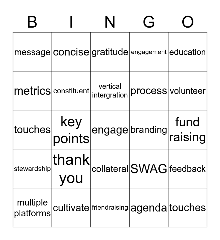 This bingo card has a free space and 33 words: team, appreciation, key points, calendar, stewardship, constituent, education, multiple platforms, concise, collaborate, vertical intergration, gratitude, tchotchke, audience, branding, volunteer, cultivate, touches, thank you, SWAG, collateral, donor, message, fund raising, friendraising, touches, engagement, process, metrics, feedback, purpose, agenda and focus.