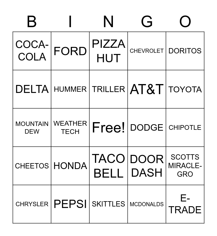 This bingo card has a free space and 44 words: GODADDY, E-TRADE, OLD SPICE, CHRYSLER, BUDWEISER, MCDONALDS, PIZZA HUT, FED EX, DORITOS, PEPSI, CHEVROLET, DODGE, TACO BELL, HONDA, M&M'S, SKITTLES, TURBO TAX, MOUNTAIN DEW, BUD LIGHT, TOYOTA, FORD, MILLER, MICHELOB ULTRA, COCA-COLA, SNICKERS, CHIPOTLE, MERCARI, ANHEUSER-BUSCH, DOOR DASH, CHEETOS, VROOM, SCOTTS MIRACLE-GRO, FRITO LAY, PRINGLES, WEATHER TECH, SNICKERS, CHOBANI, UPS, TRILLER, DELTA, AT&T, FIVERR, HUMMER and BUD LIGHT SELTZER.