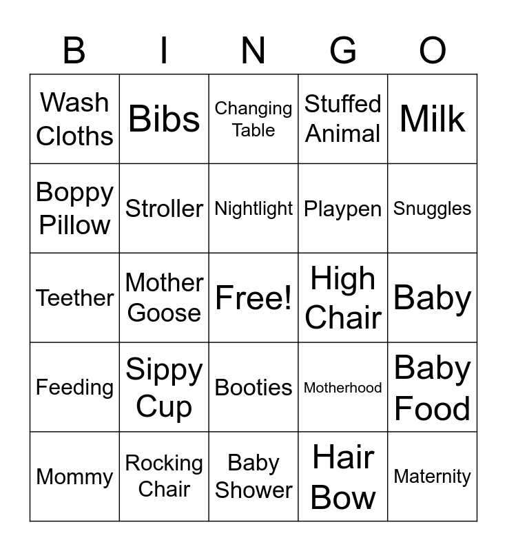 This bingo card has a free space and 26 words: Booties, Hair Bow, Nightlight, Rocking Chair, Milk, Wash Cloths, Boppy Pillow, Bibs, Baby, Motherhood, Playpen, Teether, Baby Food, Mommy, Mother Goose, Ultrasound, Stuffed Animal, Feeding, Changing Table, Maternity, Snuggles, Baby Shower, High Chair, Sippy Cup, Stroller and Onesies.