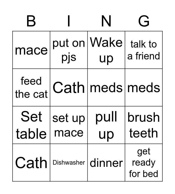 This bingo card has 16 words: Dishwasher, brush teeth, Wake up, mace, Set table, put on pjs, pull up, dinner, feed the cat, Cath, Cath, talk to a friend, set up mace, meds, meds and get ready for bed.