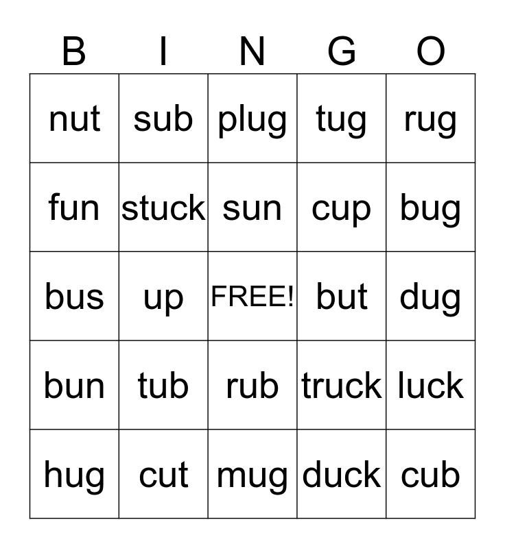This bingo card has a free space and 24 words: tub, cut, sun, hug, rug, nut, fun, sub, but, rub, cup, bus, truck, luck, stuck, duck, dug, plug, bug, up, cub, bun, tug and mug.