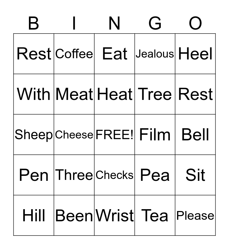 This bingo card has a free space and 24 words: Three, Been, Heat, Hill, Heel, Rest, With, Coffee, Film, Checks, Tree, Sheep, Pea, Sit, Meat, Tea, Bell, Eat, Rest, Cheese, Please, Pen, Jealous and Wrist.