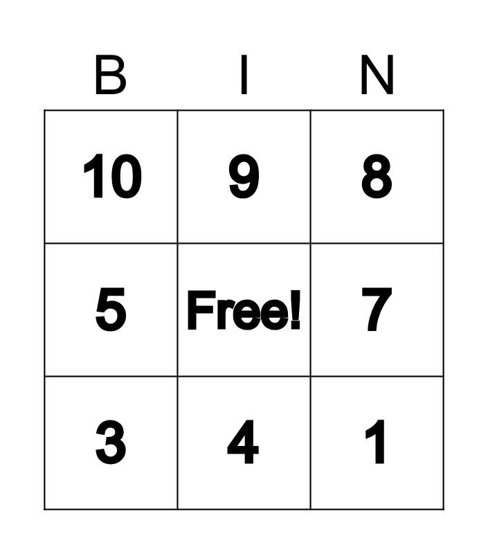 This bingo card has a free space and 11 words: 2, 4, 1, 3, 9, 8, 7, 6, 5, 10 and 0.