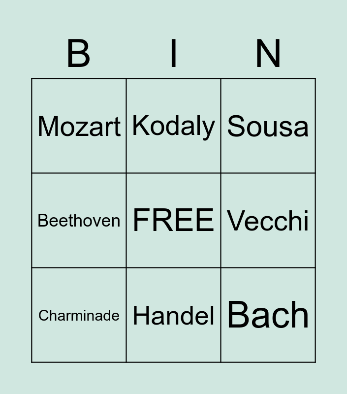 This bingo card has a free space and 12 words: Wagner, Falla, Bach, Vecchi, Kodaly, Sousa, Handel, Tchaikovsky, Mozart, Beethoven, Charminade and Holst.