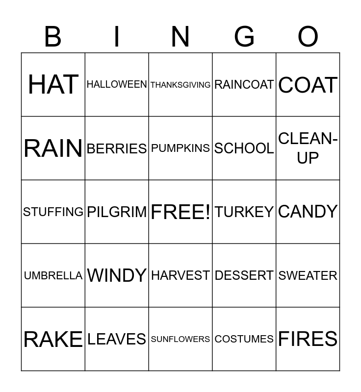 This bingo card has a free space and 24 words: WINDY, LEAVES, PUMPKINS, RAKE, COAT, HAT, RAIN, HALLOWEEN, TURKEY, HARVEST, SCHOOL, STUFFING, DESSERT, SWEATER, BERRIES, COSTUMES, CANDY, THANKSGIVING, CLEAN-UP, PILGRIM, FIRES, UMBRELLA, RAINCOAT and SUNFLOWERS.