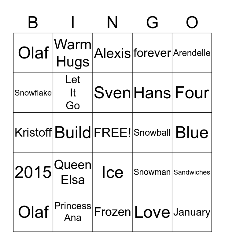 This bingo card has a free space and 24 words: Queen Elsa, Princess Ana, Sven, Olaf, Arendelle, Olaf, Snowflake, Warm Hugs, Snowball, Ice, Hans, Kristoff, Snowman, Sandwiches, Let It Go, Love, Blue, Alexis, Four, Build, January, 2015, forever and Frozen.