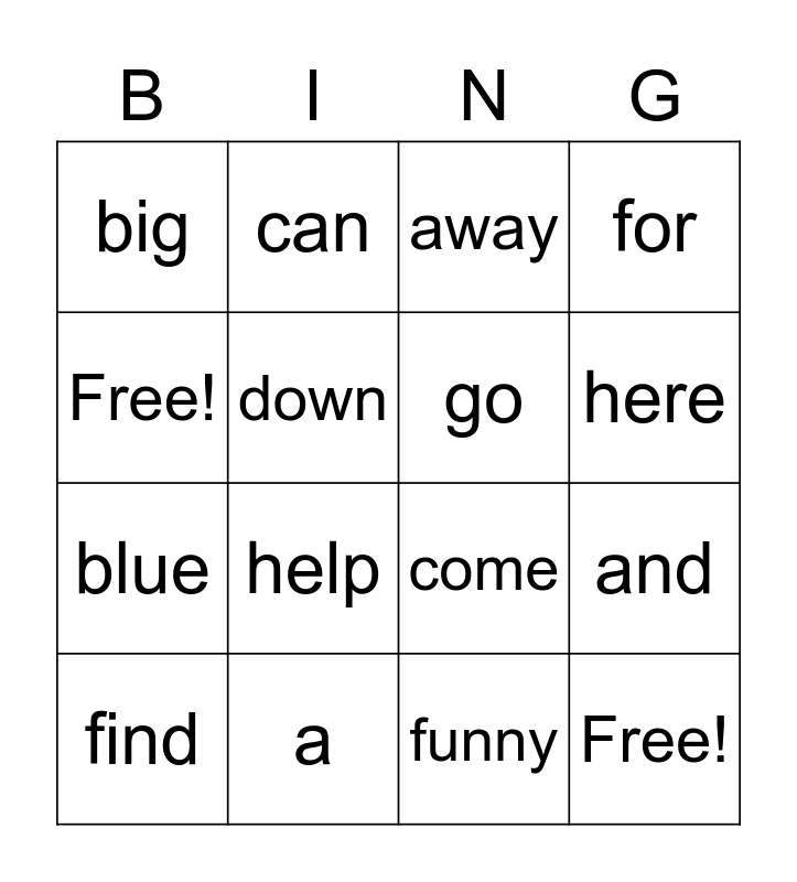 This bingo card has 16 words: a, and, away, big, blue, can, come, funny, Free!, down, find, for, help, here, go and Free!.