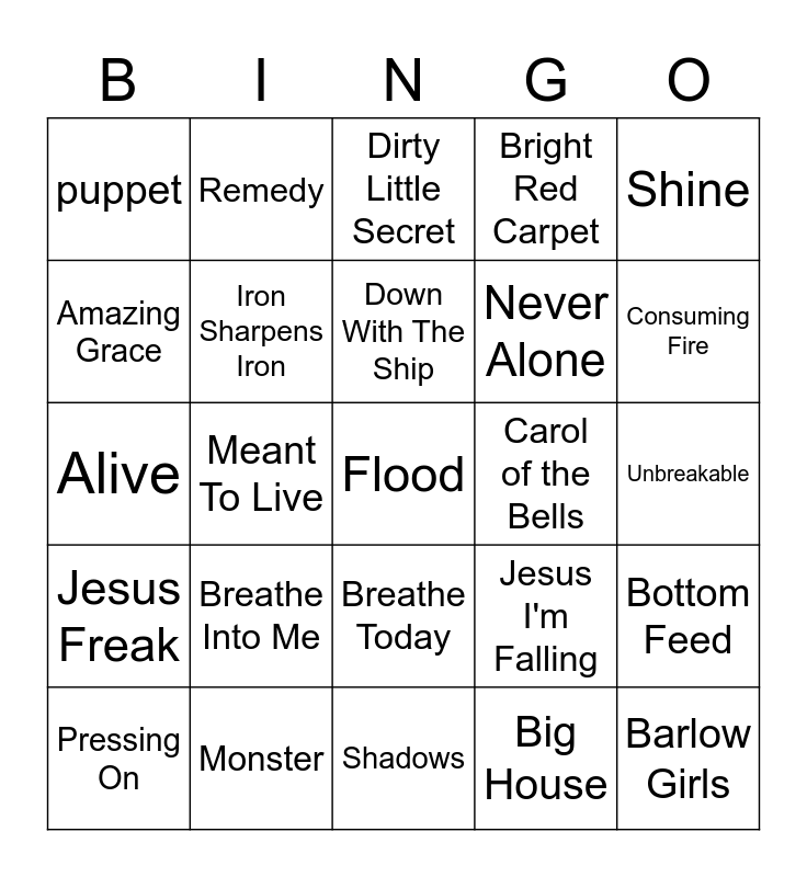 This bingo card has 25 words: Jesus Freak, Monster, Flood, Big House, Shine, puppet, Remedy, Dirty Little Secret, Carol of the Bells, Bottom Feed, Amazing Grace, Iron Sharpens Iron, Shadows, Jesus I'm Falling, Consuming Fire, Pressing On, Meant To Live, Down With The Ship, Never Alone, Unbreakable, Alive, Breathe Into Me, Breathe Today, Bright Red Carpet and Barlow Girls.