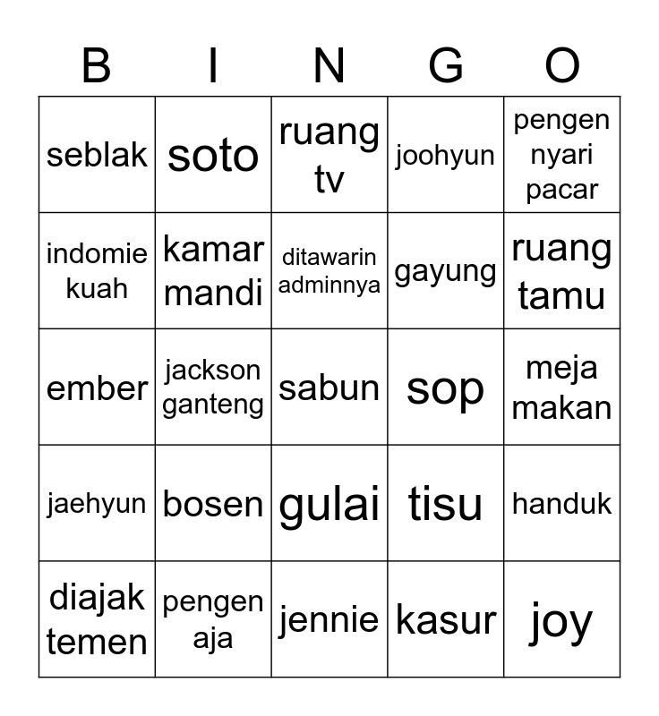This bingo card has a free space and 24 words: bosen, pengen aja, ditawarin adminnya, diajak temen, pengen nyari pacar, seblak, indomie kuah, soto, sop, gulai, gayung, ember, tisu, handuk, kamar mandi, kasur, meja makan, ruang tv, ruang tamu, jackson ganteng, joy, jaehyun, joohyun and jennie.