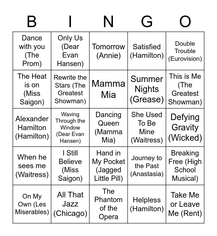 This bingo card has 41 words: Free!, Alexander Hamilton (Hamilton), Seasons of Love (Rent), Rewrite the Stars (The Greatest Showman), All That Jazz (Chicago), Hand in My Pocket (Jagged Little Pill), Mamma Mia, You're the One that I Want (Grease), Double Trouble (Eurovision), When he sees me (Waitress), Waving Through the Window (Dear Evan Hansen), Satisfied (Hamilton), Dancing Queen (Mamma Mia), Defying Gravity (Wicked), She Used To Be Mine (Waitress), I Still Believe (Miss Saigon), Memory (Cats), Dance with you (The Prom), Once Upon a December (Anastasia), Tomorrow (Annie), Breaking Free (High School Musical), Take Me or Leave Me (Rent), The Phantom of the Opera, Summer Nights (Grease), And I Am Telling You I'm Not Going (Dreamgirls), Man Up (The Book of Mormon), Helpless (Hamilton), It's a Hard Knock Life (Annie), This is Me (The Greatest Showman), I Believe (The Book of Mormon), We Go Together (Grease), Only Us (Dear Evan Hansen), On My Own (Les Miserables), Words Fail (Dear Evan Hansen), Journey to the Past (Anastasia), The Heat is on (Miss Saigon), Popular (Wicked), Hygge (Frozen), You Can't Stop the Beat (Hairspray), Tha's How you Know (Enchanted) and Sherry (Jersey Boys).