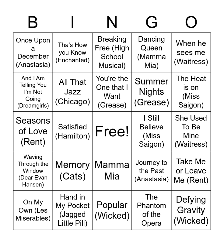 This bingo card has a free space and 40 words: Alexander Hamilton (Hamilton), Seasons of Love (Rent), Rewrite the Stars (The Greatest Showman), All That Jazz (Chicago), Hand in My Pocket (Jagged Little Pill), Mamma Mia, You're the One that I Want (Grease), Double Trouble (Eurovision), When he sees me (Waitress), Waving Through the Window (Dear Evan Hansen), Satisfied (Hamilton), Dancing Queen (Mamma Mia), Defying Gravity (Wicked), She Used To Be Mine (Waitress), I Still Believe (Miss Saigon), Memory (Cats), Dance with you (The Prom), Once Upon a December (Anastasia), Tomorrow (Annie), Breaking Free (High School Musical), Take Me or Leave Me (Rent), The Phantom of the Opera, Summer Nights (Grease), And I Am Telling You I'm Not Going (Dreamgirls), Man Up (The Book of Mormon), Helpless (Hamilton), It's a Hard Knock Life (Annie), This is Me (The Greatest Showman), I Believe (The Book of Mormon), We Go Together (Grease), Only Us (Dear Evan Hansen), On My Own (Les Miserables), Words Fail (Dear Evan Hansen), Journey to the Past (Anastasia), The Heat is on (Miss Saigon), Popular (Wicked), Hygge (Frozen), You Can't Stop the Beat (Hairspray), Tha's How you Know (Enchanted) and Sherry (Jersey Boys).