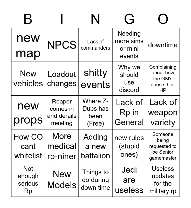 This bingo card has a free space and 24 words: Not enough serious Rp, More medical rp-niner, shitty events, Jedi are useless, downtime, new map, NPCS, Lack of commanders, Lack of Rp in General, Lack of weapon variety, new props, Loadout changes, new rules (stupid ones), Someone being requested to be Senior gamemaster, New vehicles, New Models, Things to do during down time, Needing more sims or mini events, Complaining about how the GM's abuse their HP, How CO cant whitelist, Reaper comes in and derails meeting, Adding a new battalion, Why we should use discord and Useless updates for the military rp.