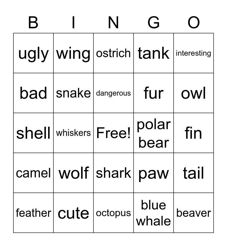 This bingo card has a free space and 26 words: shark, blue whale, dangerous, cute, interesting, ugly, bad, wing, fin, paw, fur, shell, tail, feather, whiskers, kennel, tank, camel, ostrich, beaver, owl, octopus, polar bear, wolf, snake and shark.
