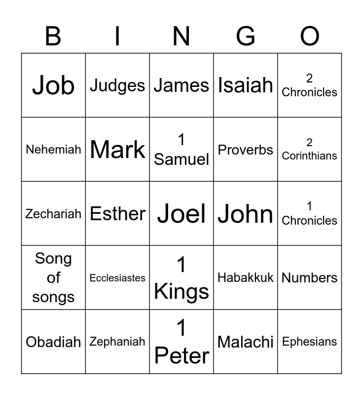 This bingo card has 66 words: Genesis, Exodus, Leviticus, Numbers, Deuteronomy, Joshua, Judges, Ruth, 1 Samuel, 2 Samuel, 1 Kings, 2 Kings, 1 Chronicles, 2 Chronicles, Ezra, Nehemiah, Esther, Job, Psalms, Proverbs, Ecclesiastes, Song of songs, Isaiah, Jeremiah, Lamentations, Ezekiel, Daniel, Hosea, Joel, Amos, Obadiah, Jonah, Micah, Nahum, Habakkuk, Zephaniah, Haggai, Zechariah, Malachi, Matthew, Mark, Luke, John, Acts, Romans, 1 Corinthians, 2 Corinthians, Galatians, Ephesians, Philippians, Colossians, 1 Thessalonians, 2 Thessalonians, 1 Timothy, 2 Timothy, Titus, Philemon, Hebrews, James, 1 Peter, 2 Peter, 1 John, 2 John, 3 John, Jude and Revelation.