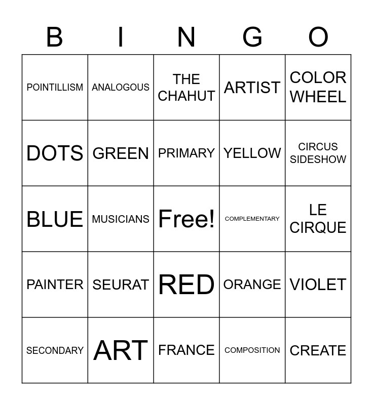 This bingo card has a free space and 25 words: SEURAT, FRANCE, PRIMARY, SECONDARY, COLOR WHEEL, POINTILLISM, DOTS, ANALOGOUS, COMPLEMENTARY, RED, YELLOW, BLUE, ORANGE, VIOLET, GREEN, GEORGES, LE CIRQUE, THE CHAHUT, CIRCUS SIDESHOW, MUSICIANS, CREATE, ART, PAINTER, ARTIST and COMPOSITION.