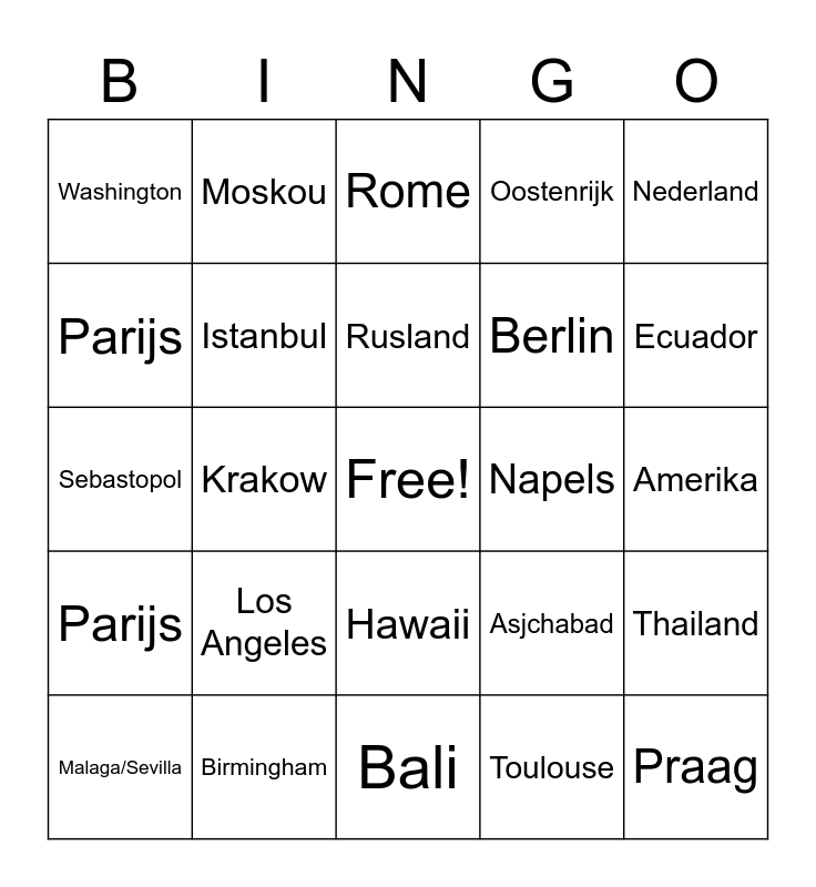 This bingo card has a free space and 64 words: Spanje, Mexico, Frankrijk, Thailand, Polen, Brazilie, Moskou, Duitsland, Rusland, China, Hawaii, Barcelona, Amerika, Nederland, England, Parijs, Krakow, Washington, London, Berlin, Los Angeles, Parijs, Oostenrijk, Zweden, Kroatie, Bratislava, Polen, Ierland, Malta, Barcelona, Reykjavik, Mexico, Rusland, Bangkok, Ecuador, Malaga/Sevilla, Salzburg, Toulouse, Galway, Istanbul, Sebastopol, Napels, Frankfurt, Monaco, Brussel, Praag, Birmingham, Belfast, Asjchabad, Abu Dhabi, Australie, India, Bali, Japan, Chicago, Rio de Janeiro, Rome, Jerusalem, South Africa, Mali, Canada, South Sudan, Mongolia and Chile.