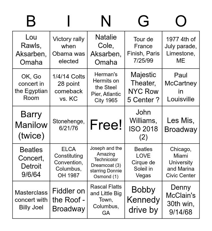 This bingo card has a free space and 41 words: Wicked (twice), Barry Manilow (twice), 2018 Players Championship Photo Op with Adam Scott, 1/4/14 Colts 28 point comeback vs. KC, Fiddler on the Roof - Broadway, Joseph and the Amazing Technicolor Dreamcoat (3) starring Donnie Osmond (1), Herman's Hermits on the Steel Pier, Atlantic City 1965, 1992 Indy 500, 1977 4th of July parade, Limestone, ME, Beatles Concert, Detroit 9/6/64, Stonehenge, 6/21/76, Tour de France Finish, Paris 7/25/99, Denny McClain's 30th win, 9/14/68, Les Mis, Broadway, John Williams, ISO 2018 (2), ELCA Constituting Convention, Columbus, OH 1987, Gloria Estefan, Aksarben, Omaha, Lou Rawls, Aksarben, Omaha, Anne Murray, Aksarben, Omaha, Natalie Cole, Aksarben, Omaha, Chicago, Miami University and Marina Civic Center, Terri Fator, Mirage, Las Vegas, Rascal Flatts and Little Big Town, Columbus, GA, Majestic Theater, NYC Row 5 Center ?, 2009 Churchwide Assembly tornado at the Minneapolis Skyway, Santana, Indiana State Fair Grounds 47 years ago, Bobby Kennedy drive by, Rudolph Nureyev, Arie Crown Theatre in Chicago, Paul McCartney in Louisville, Joshua Bell, James Galway and Itzhak Perlman concerts, Equus on Broadway featuring full-frontal nudity, Victory rally when Obama was elected, Masterclass concert with Billy Joel, Discovering a thumbnail print on an ancient artifact, Beatles LOVE Cirque de Soleil in Vegas, OK, Go concert in the Egyptian Room, Panic! At the Disco concert (twice), First mosh pit at a Frank Turner concert, Shakespeare in Boston Common, Colts/Bucs game in Tampa and Colts game when Pence walked out..
