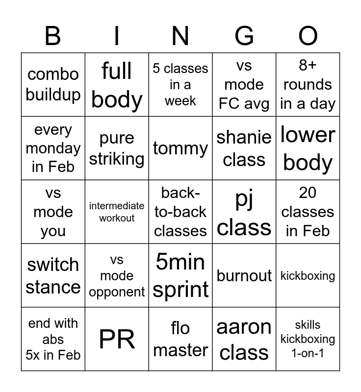 This bingo card has a free space and 24 words: vs mode opponent, PR, tommy, end with abs 5x in Feb, 8+ rounds in a day, combo buildup, every monday in Feb, full body, pj class, 5min sprint, shanie class, vs mode you, burnout, kickboxing, pure striking, aaron class, 20 classes in Feb, 5 classes in a week, lower body, intermediate workout, skills kickboxing 1-on-1, switch stance, vs mode FC avg and flo master.