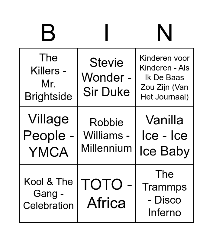 This bingo card has 30 words: Guns N' Roses - Sweet Child O' Mine, Jamiroquai - Cosmic Girl, Joy Division - Love Will Tear Us Apart, Katy Perry - Firework, The Killers - Mr. Brightside, Kinderen voor Kinderen - Als Ik De Baas Zou Zijn (Van Het Journaal), Kool & The Gang - Celebration, Lil Nas X - Old Town Road (feat. Billy Ray Cyrus), Limp Bizkit - Rollin', Lipps Inc. - Funkytown, Madness - Baggy Trousers, Midnight Oil - Beds Are Burning, Monique Smit - Blijf Je Vanavond, Muse - Plug in Baby, Nirvana - Lithium, The Outhere Brothers - Boom Boom Boom, Pat Benatar - Love Is A Battlefield, The Police - Message In A Bottle, Ricky Martin - Livin' la Vida Loca, Robbie Williams - Millennium, Sigma - Nobody To Love, Simple Minds - Don't You (Forget About Me), Stevie Wonder - Sir Duke, The Trammps - Disco Inferno, Vanilla Ice - Ice Ice Baby, Village People - YMCA, The Weeknd - Can't Feel My Face, Will Smith - Men In Black, TOTO - Africa and Elton John - I'm Still Standing.
