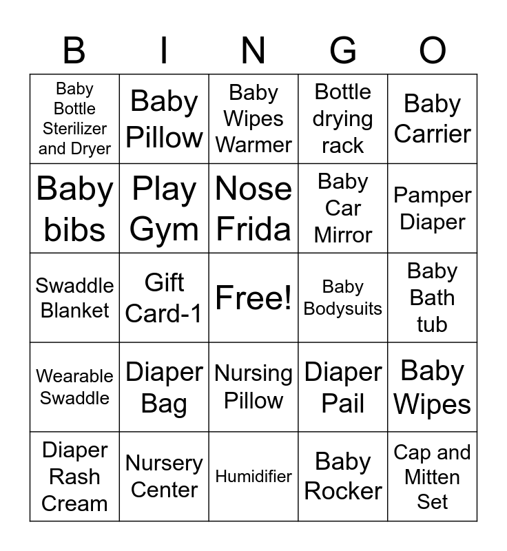 This bingo card has a free space and 30 words: Nursery Center, Bottle Set, Gift Card-1, Baby Monitor Camera, Baby Bottle Sterilizer and Dryer, Baby Wipes Warmer, Play Gym, Nursing Pillow, Baby Bodysuits, Humidifier, Baby Bath tub, Cap and Mitten Set, Baby Rocker, Diaper Caddy, Pamper Diaper, Car Seat and Stroller, Diaper Pail, Wearable Swaddle, Diaper Bag, Baby Carrier, Swaddle Blanket, Gift Card-2, Baby Pillow, Baby Car Mirror, Baby bibs, Bottle drying rack, Baby Wipes, Diaper Rash Cream, Nose Frida and Health & Grooming Kit.