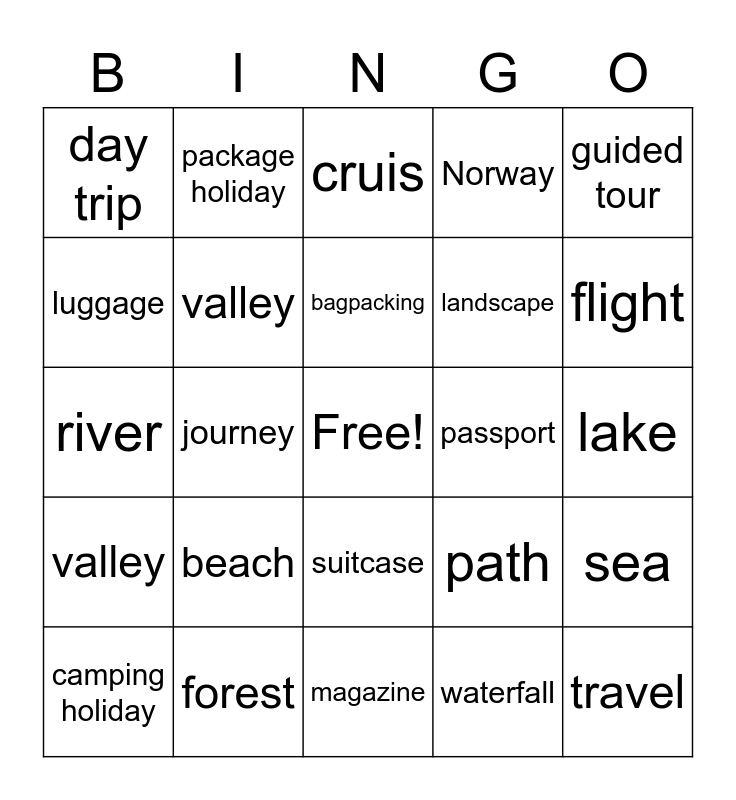 This bingo card has a free space and 24 words: beach, forest, bagpacking, camping holiday, guided tour, day trip, luggage, package holiday, passport, suitcase, landscape, river, path, sea, valley, waterfall, lake, cruis, flight, journey, travel, valley, Norway and magazine.