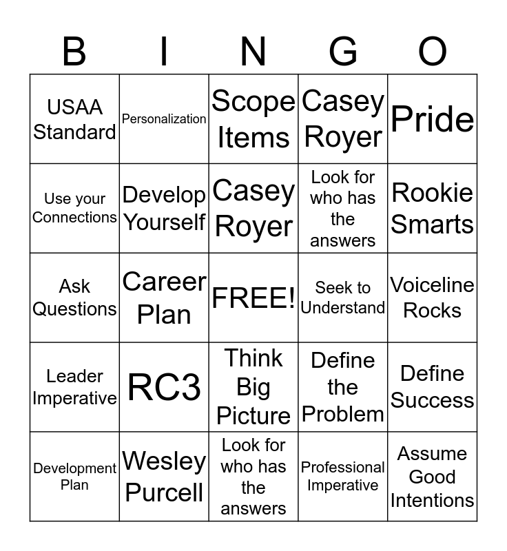 This bingo card has a free space and 24 words: RC3, Wesley Purcell, Casey Royer, Development Plan, Pride, USAA Standard, Use your Connections, Personalization, Seek to Understand, Think Big Picture, Look for who has the answers, Ask Questions, Define the Problem, Define Success, Develop Yourself, Professional Imperative, Voiceline Rocks, Scope Items, Rookie Smarts, Career Plan, Assume Good Intentions, Leader Imperative, Casey Royer and Look for who has the answers.