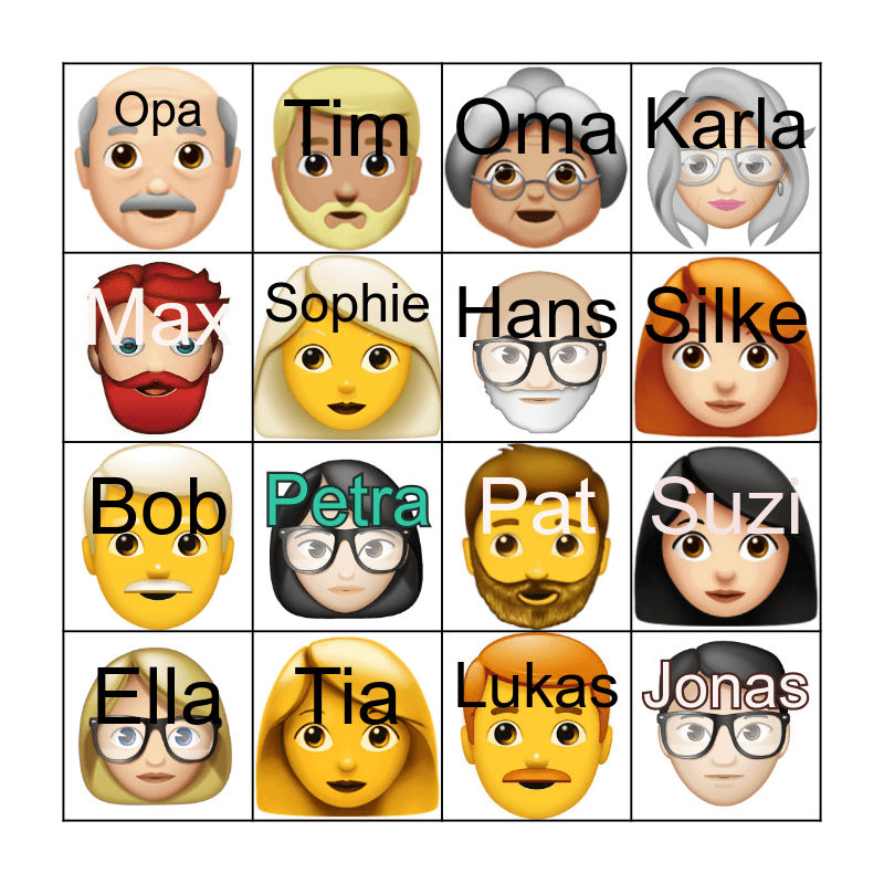 This bingo card has 16 images and 16 words: Tia, Suzi, Oma, Opa, Bob, Tim, Pat, Lukas, Max, Sophie, Ella, Karla, Petra, Silke, Hans and Jonas.