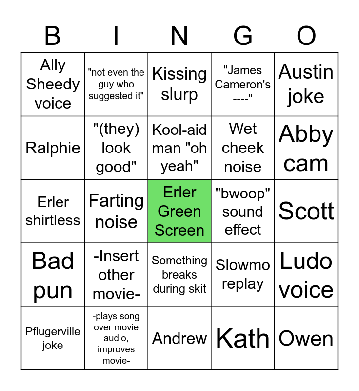 This bingo card has a free space and 29 words: Pflugerville joke, "I like to watch", Farting noise, Fake acronym, Ally Sheedy voice, Kissing slurp, "(they) look good", -Insert other movie-, "bwoop" sound effect, -plays song over movie audio, improves movie-, Scott, Owen, Andrew, Kath, Abby cam, Yakety Sacks, Something breaks during skit, Bad pun, Austin joke, Erler shirtless, Slowmo replay, actor suddenly there "aah'", Wet cheek noise, Ralphie, "James Cameron's ----", "not even the guy who suggested it", Ludo voice, Kool-aid man "oh yeah" and Sunshine of your Love drugs.