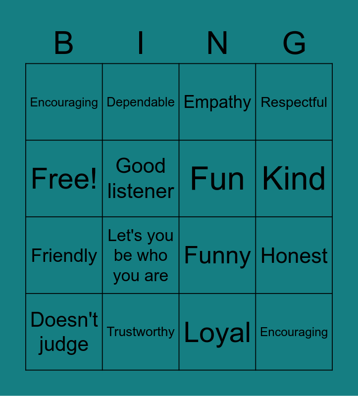 This bingo card has 16 words: Trustworthy, Honest, Empathy, Encouraging, Friendly, Dependable, Funny, Loyal, Free!, Good listener, Doesn't judge, Respectful, Let's you be who you are, Kind, Fun and Encouraging.