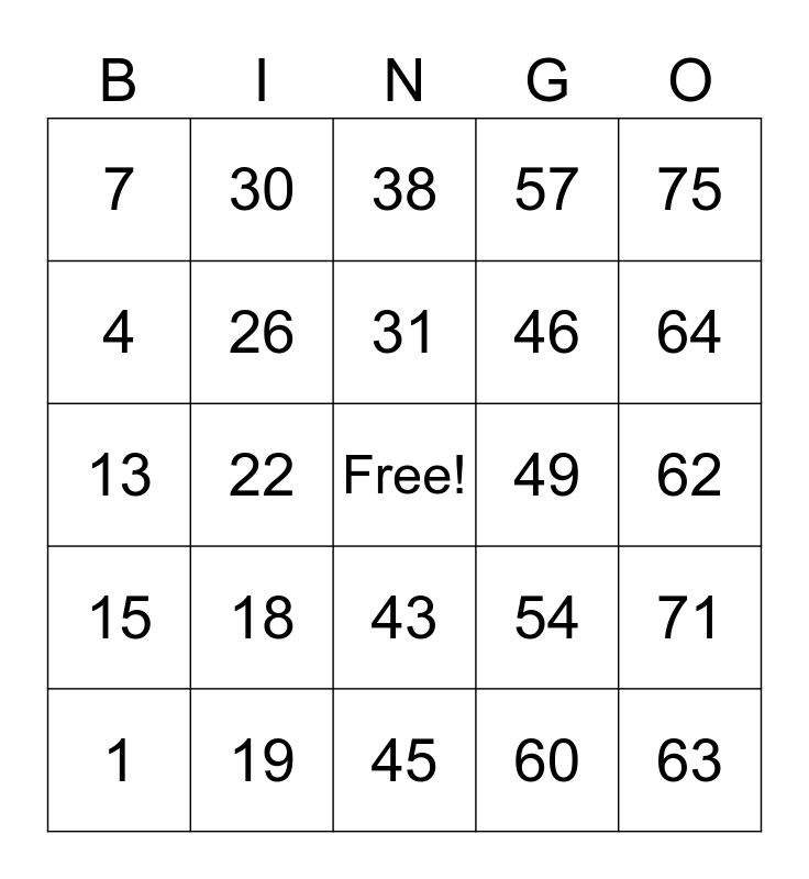 This bingo card has a free space and 24 words: 1, 18, 31, 60, 75, 7, 30, 38, 49, 62, 13, 26, 54, 71, 4, 19, 45, 57, 64, 15, 22, 43, 46 and 63.
