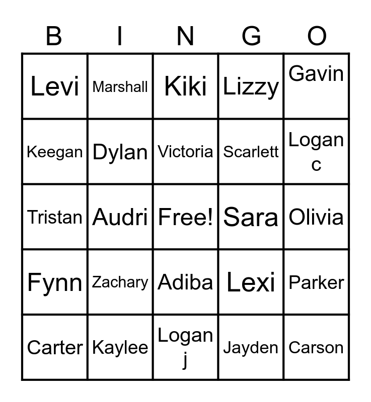 This bingo card has a free space and 26 words: Adiba, Jayden, Victoria, Kaylee, Gavin, Levi, Keegan, Marshall, Olivia, Lexi, Scarlett, Tristan, Parker, Carter, Audri, Madison, Lizzy, Fynn, Kiki, Carson, Logan c, Logan j, Sara, Zachary, Dylan and Maverrick.