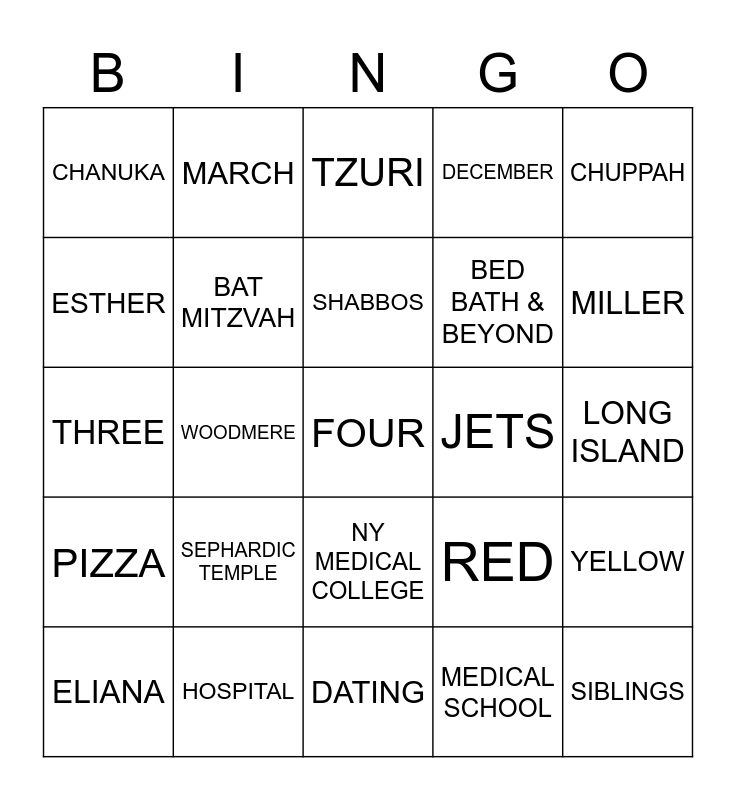 This bingo card has 71 words: Free!, MARCH, JUNE, ONE, DATING, MAY, DECEMBER, MERZEL, BED BATH & BEYOND, REGISTRY, ELIANA, TWO, MILLER, CHANUKA, MARANS, THREE, RED, CHUPPAH, QUEENS, LONG ISLAND, SEPHARDIC TEMPLE, FOUR, YELLOW, VALHALLA, HALB, ZOOM, WESTCHESTER, DOCTOR, DAVID, CAR, HOSPITAL, FIVE, CARRIE, ZEV, MEDICAL SCHOOL, YOSEF, TALIA, MICHAL, ESTHER, ELISHEVA, NY MEDICAL COLLEGE, SIBLINGS, PIZZA, ICE CREAM, TOMATOES, KUGEL, CHALLAH, BAT MITZVAH, SHEVA BRACHOT, SKA, CHICAGO, ISRAEL, JETS, SHAALVIM, STERN, SOFTBALL, SHABBOS, PHYSICAL THERAPY, CHIEF, FRIENDS, SPORTS, BASKETBALL, WOODMERE, ENGAGED, THANKSGIVING, FANTASY FOOTBALL, TZURI, ILLINOIS, NIECES AND NEPHEWS, WASHINGTON HEIGHTS and WEDDING.
