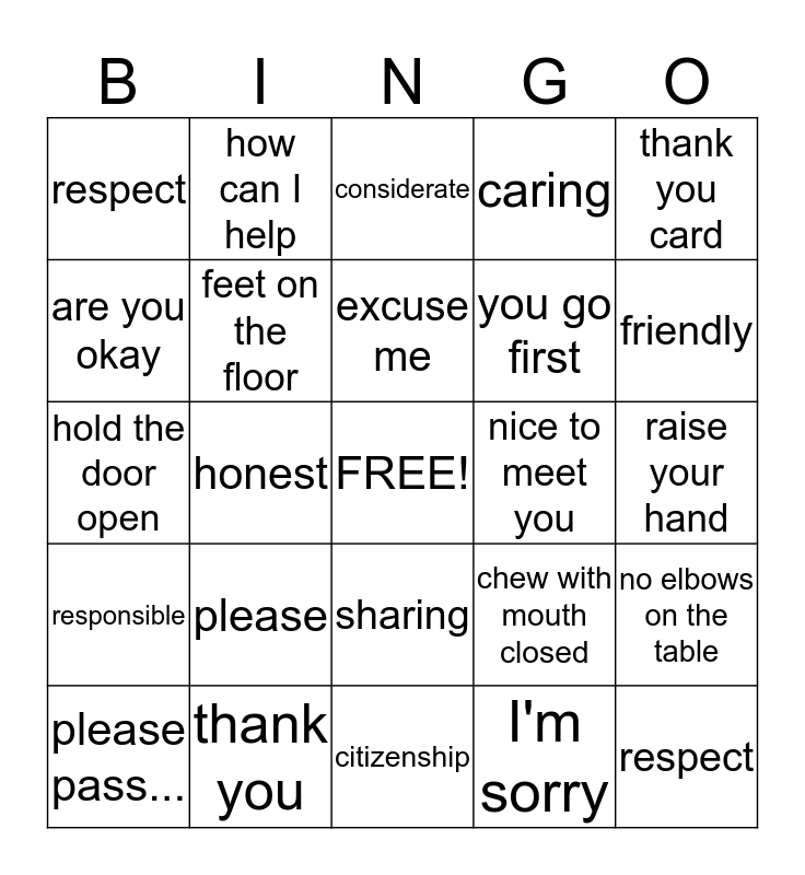 This bingo card has a free space and 24 words: please, thank you, excuse me, please pass..., thank you card, respect, are you okay, how can I help, nice to meet you, sharing, you go first, hold the door open, chew with mouth closed, no elbows on the table, feet on the floor, I'm sorry, raise your hand, considerate, friendly, honest, respect, responsible, caring and citizenship.