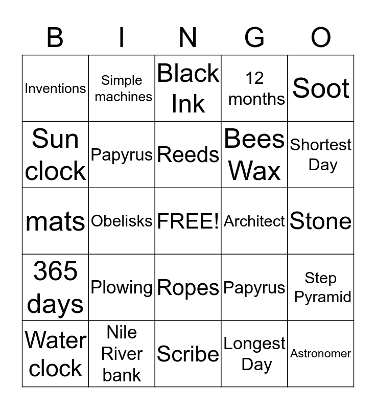 This bingo card has a free space and 24 words: Plowing, Nile River bank, Reeds, Water clock, Soot, Inventions, Sun clock, Simple machines, Architect, Ropes, Bees Wax, mats, Papyrus, Step Pyramid, Papyrus, Longest Day, Stone, Black Ink, Shortest Day, Obelisks, Astronomer, 365 days, 12 months and Scribe.