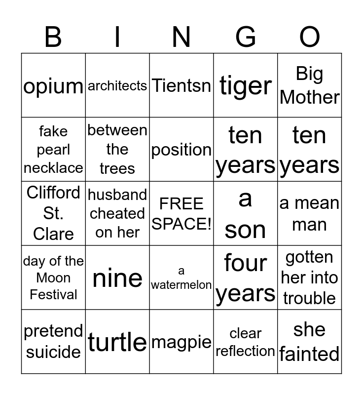 This bingo card has a free space and 24 words: nine, turtle, position, pretend suicide, Big Mother, opium, fake pearl necklace, architects, a son, a watermelon, ten years, Clifford St. Clare, four years, gotten her into trouble, between the trees, clear reflection, a mean man, Tientsn, ten years, husband cheated on her, she fainted, day of the Moon Festival, tiger and magpie.