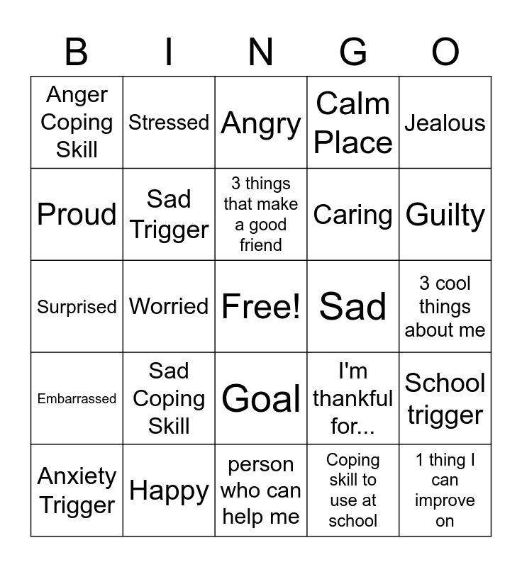 This bingo card has a free space and 29 words: Anxiety Trigger, Anxiety Coping Skill, Worried, Anger Trigger, Anger Coping Skill, Angry, Sad Trigger, Sad Coping Skill, Sad, Happy, 3 cool things about me, 1 thing I can improve on, person who can help me, Coping skill to use at school, Guilty, I help others by, Goal, Embarrassed, Jealous, Surprised, I'm thankful for..., Responsbile, Caring, Proud, Calm Place, Stressed, School trigger, 3 things that make a good friend and Achievement.