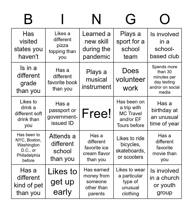 This bingo card has a free space and 24 words: Attends a different school than you, Likes to get up early, Plays a musical instrument, Has a different kind of pet than you, Is involved in a school-based club, Has visited states you haven't, Is in a different grade than you, Likes a different pizza topping than you, Has been on a trip with MC Travel and/or EF Tours before, Has a different favorite ice cream flavor than you, Does volunteer work, Likes to drink a different soft drink than you, Likes to ride bicycles, skateboards, or scooters, Has a different favorite movie than you, Has a different favorite book than you, Likes to wear a particular type of unusual clothing, Has a birthday at an unusual time of year, Learned a new skill during the pandemic, Spends more than 30 minutes per day texting and/or on social media, Has a passport or government-issued ID, Is involved in a church or youth group, Has been to NYC, Boston, Washington D.C., or Philadelphia before, Plays a sport for a school team and Has earned money from someone other than parents.