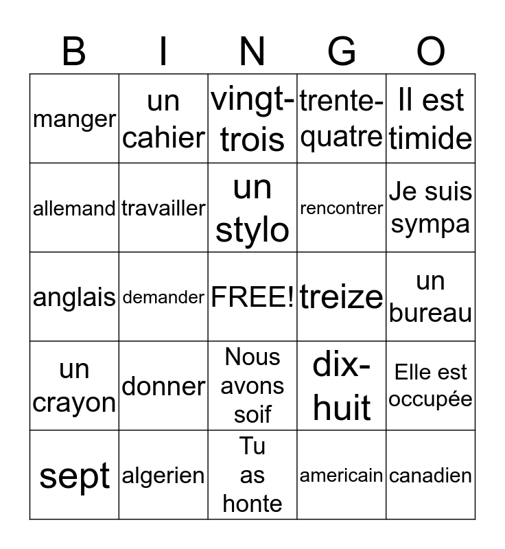 This bingo card has a free space and 24 words: donner, algerien, un stylo, sept, Il est timide, manger, allemand, un cahier, treize, Nous avons soif, rencontrer, anglais, dix-huit, Elle est occupée, travailler, americain, un bureau, vingt-trois, Je suis sympa, demander, canadien, un crayon, trente-quatre and Tu as honte.